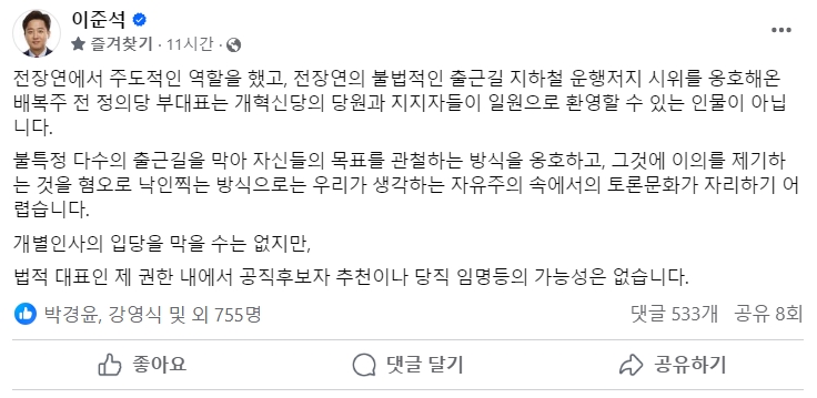 이준석 개혁신당 공동대표가 최근 자신의 페이스북을 통해 배복주 전 정의당 부대표는 결고 개혁신당 내에서 공천과 당직을 맡을 일이 없다고 원천 배제하는 말을 작성해 화재가 되고 있습니다.