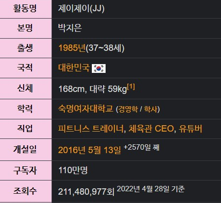 제이제이 유튜버 본명은 박지은, 1985년 출생으로 올해 나이는 39세입니다. 학력은 숙명여대를 졸업하였습니다. 현재 그녀는 유튜브 크리에이터, 체육관 '살롱드핏' 운영을 하고 있으며 서울특별시 강남구 역삼2동에 위치하며, 그곳에서 제작하는 피트니스와 다이어트 영상이 주력 컨텐츠입니다.