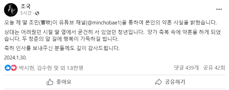 이와 관련하여 조 전 장관은 자신의 페이스북을 통해 딸의 약혼 소식을 전하면서, 예비 사위가 어려웠던 시기에 딸을 굳건히 지켜준 청년이라고 언급했습니다.